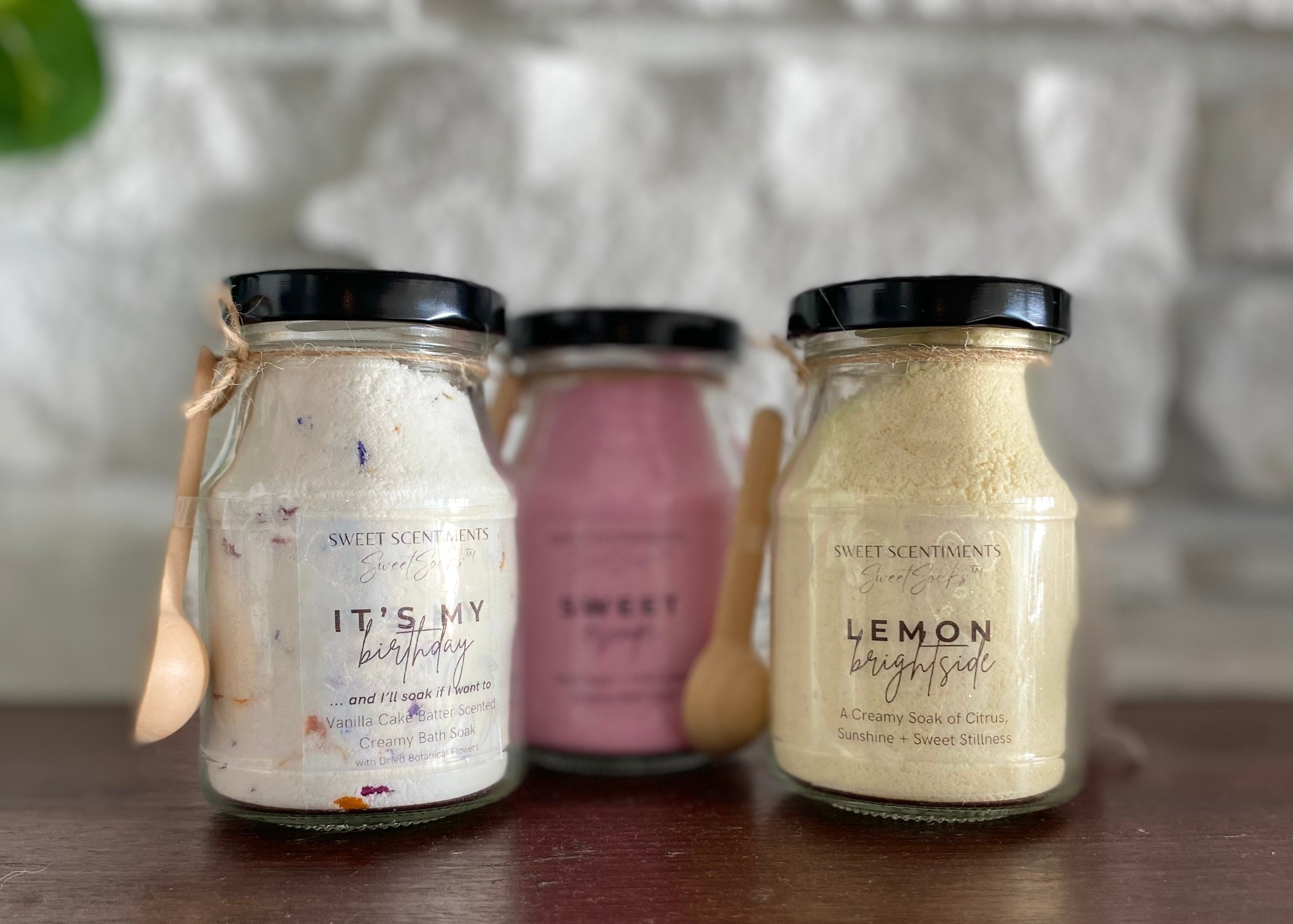 From soaps and bath scoops to shimmering soaks, dreamy salts, and room-refreshing sprays, every Sweet Scentiments self-care treat is crafted with skin-loving ingredients and a whole lot of heart. Here’s everything you might want to know about our bath-time rituals, linen sprays, and feel-good favorites — designed to soothe the skin, refresh your space, and lift the spirit.