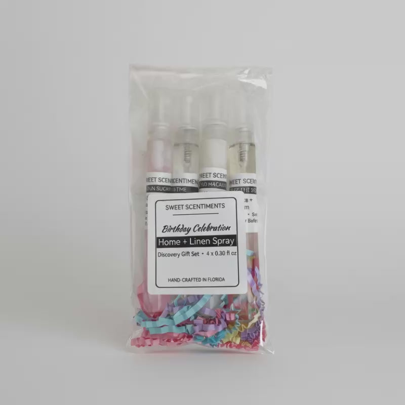 Birthday Celebration Home + Linen Spray Discovery Gift Set. A curated 4-piece mini spray set designed to sprinkle sweetness wherever it goes. Each travel-friendly size glass bottle brings a playful burst of fragrance, perfect for birthdays, party favors, teacher gifts, party bags, or adding a little scentimental magic to your day.