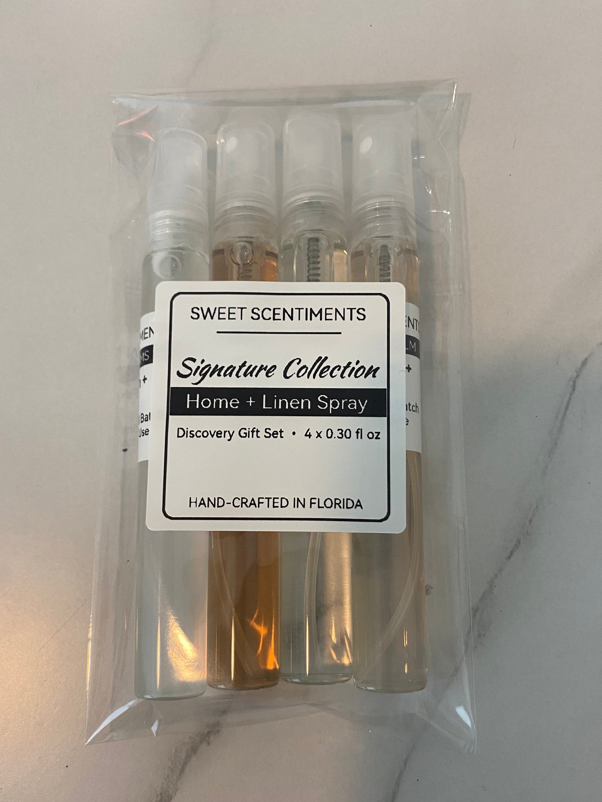 Signature Home + Linen Spray Discovery Gift Set features four of our best-selling Sweet Scentiments fragrances in petite travel friendly size glass sprays. Each scent adds a gentle, scentimental touch to linens and rooms perfect for gifting, travel, guest spaces, host gifts, teacher gifts, and everyday home refresh.