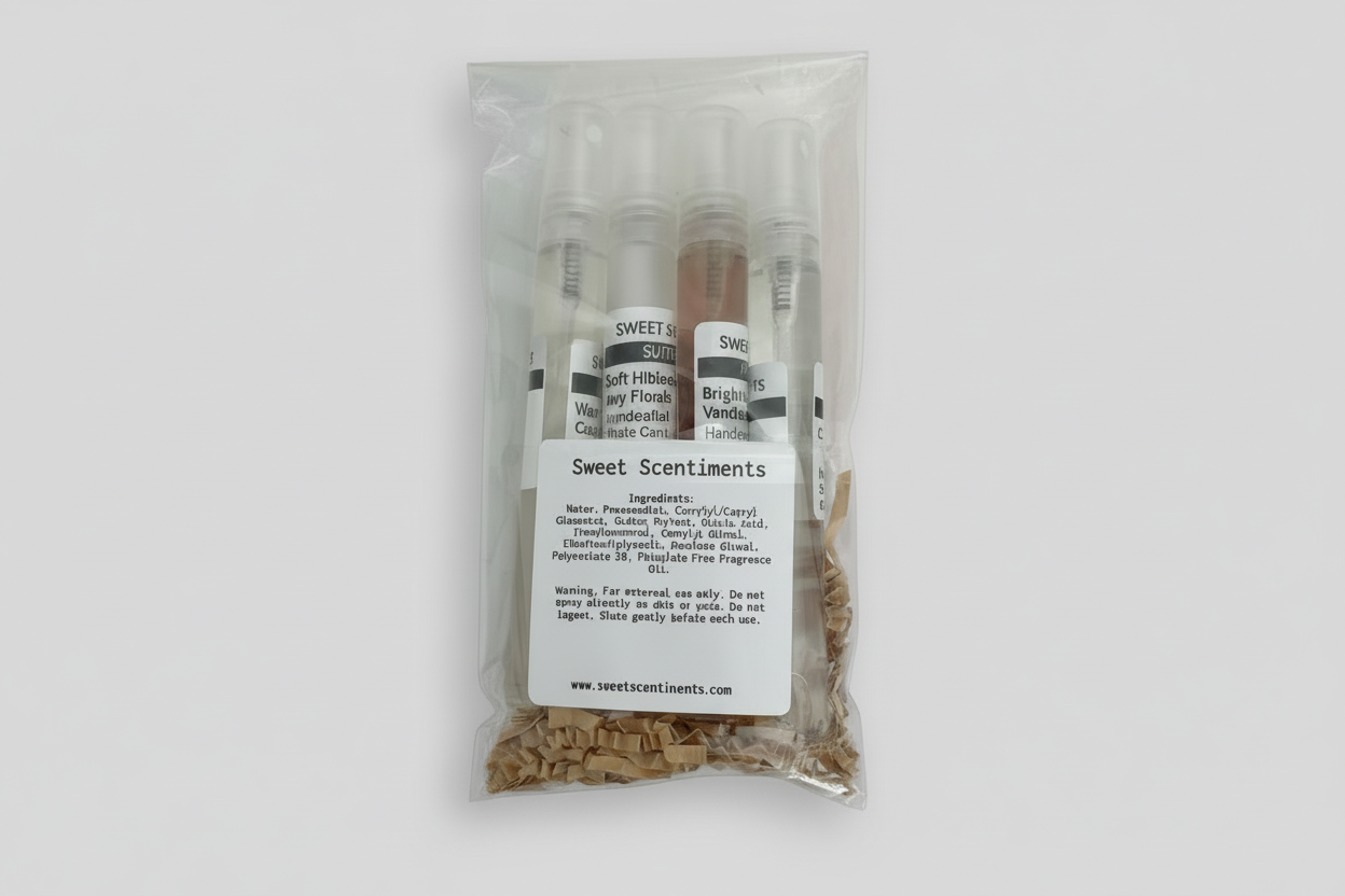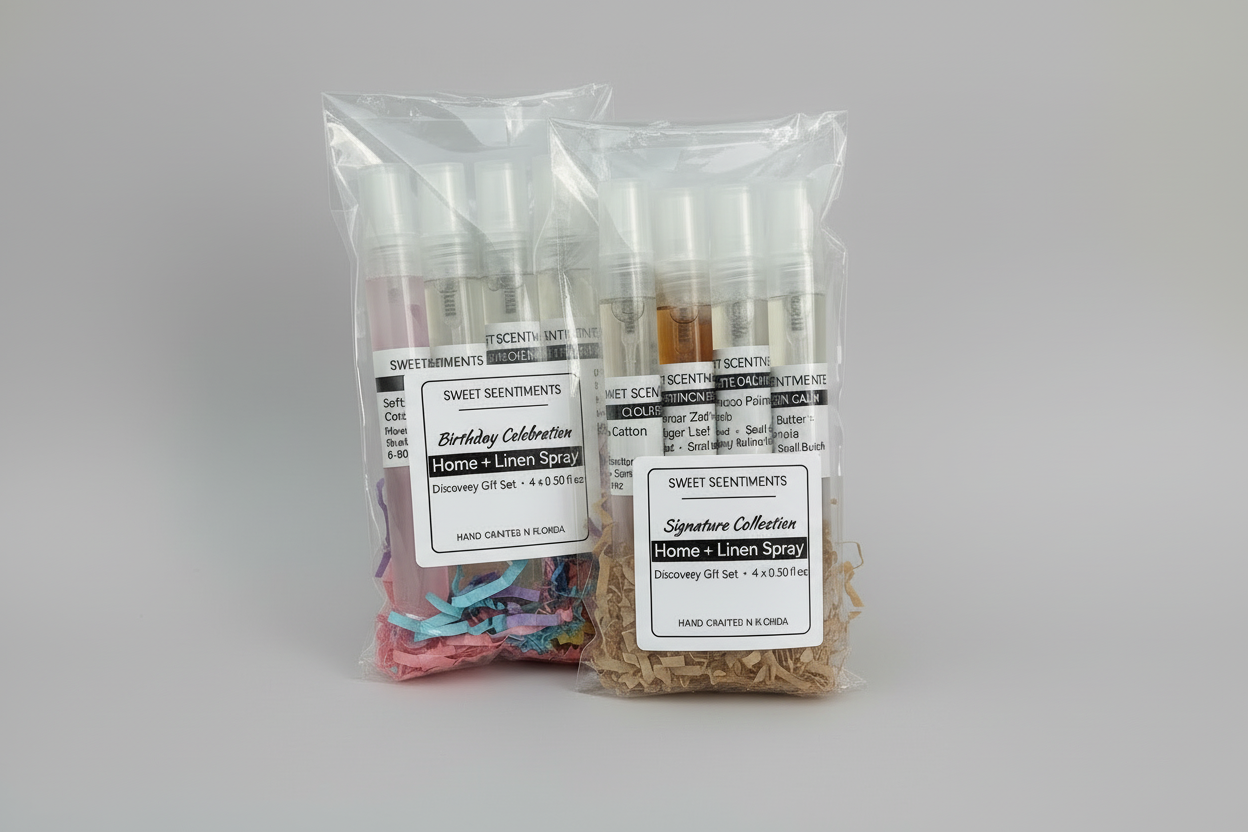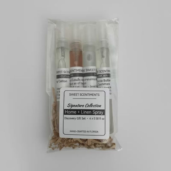 This curated Signature Room + Linen Spray Discovery Gift Set features four of our best-selling Sweet Scentiments fragrances in petite, travel-friendly glass sprays. Each scent adds a gentle, scentimental touch to linens and rooms — perfect for gifting, travel, guest spaces, host gifts, teacher gifts, and everyday home refresh.